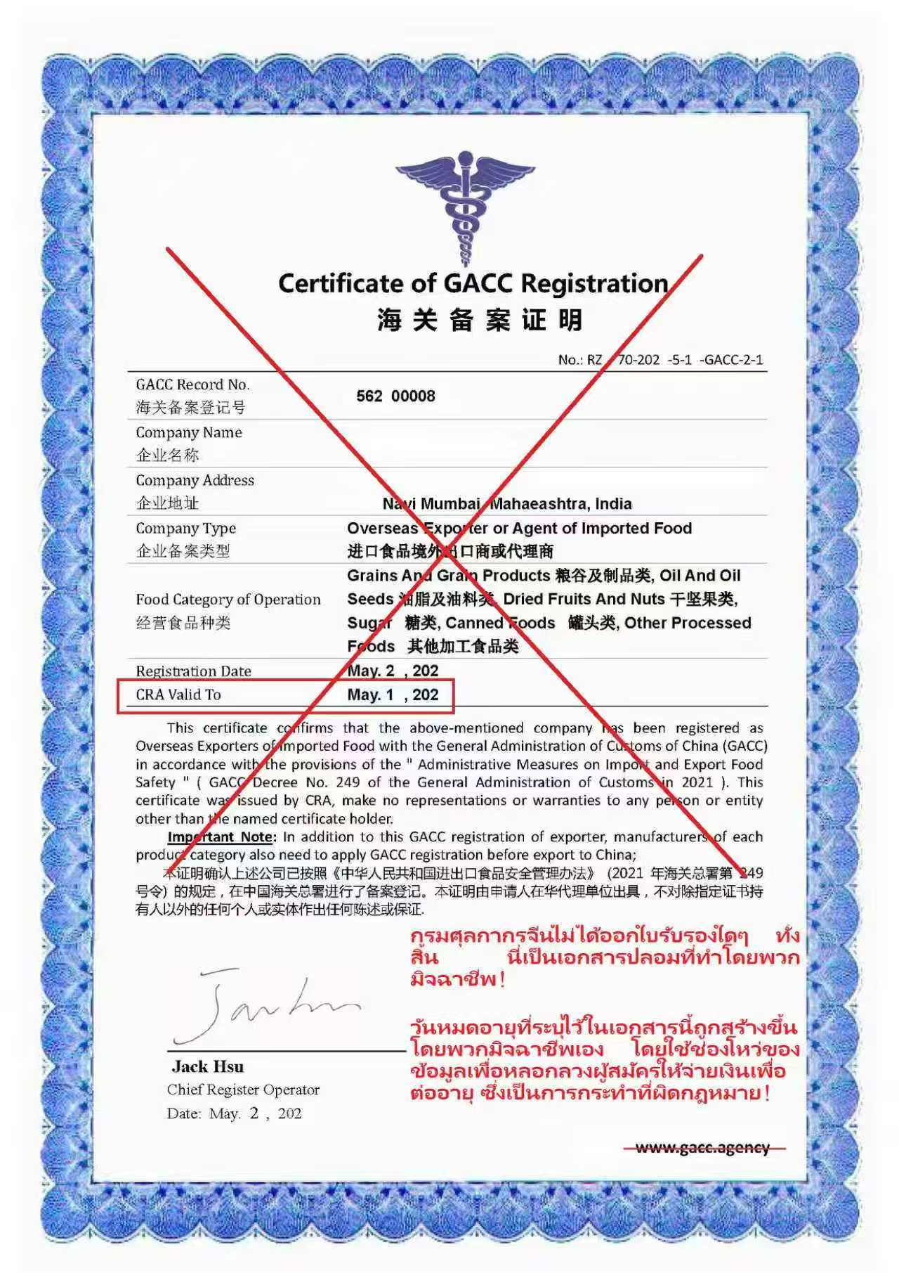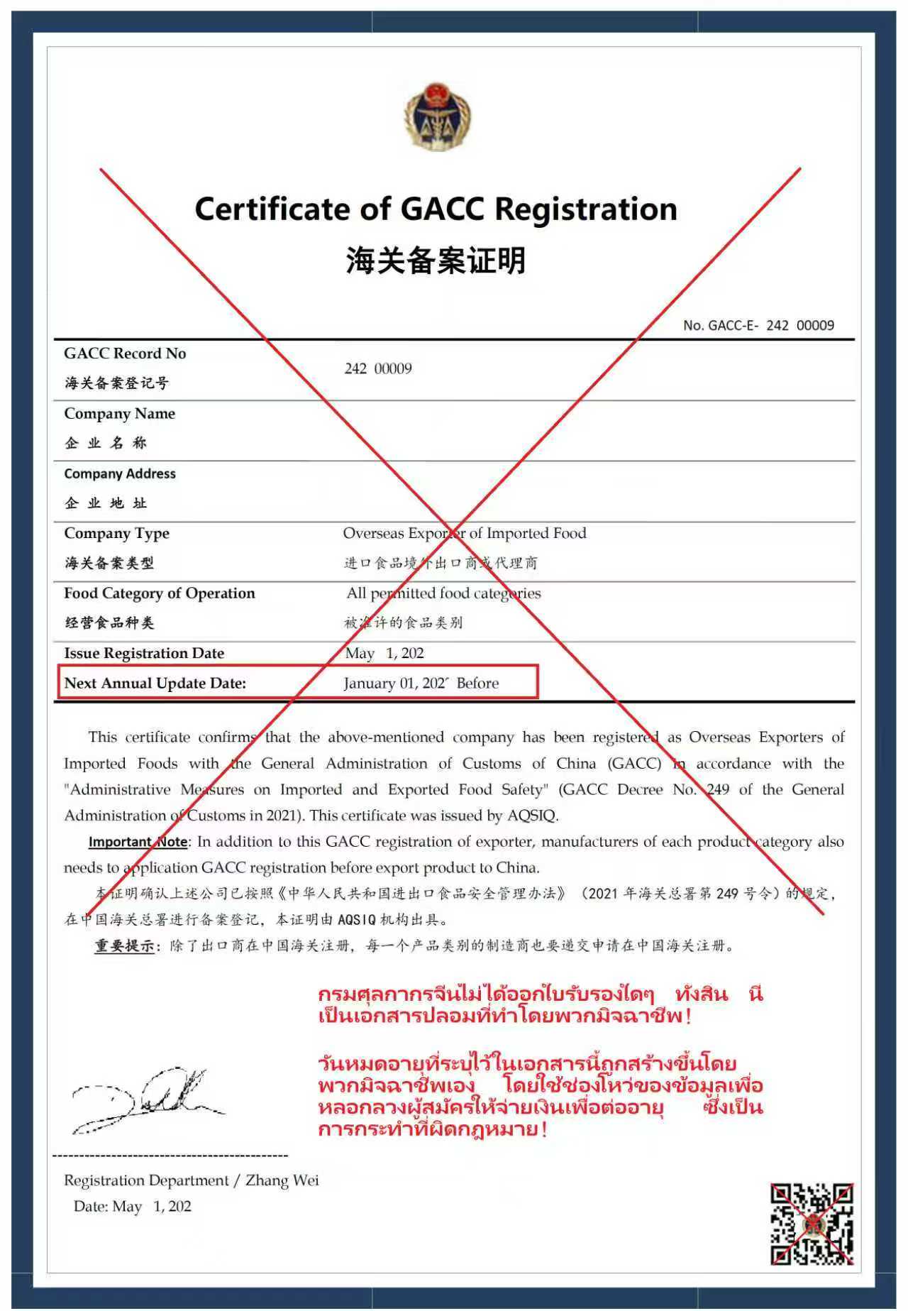 3. การทำใบรับรองของตนเองและพยายามเรียกเก็บค่าธรรมเนียมทุกปี (ศุลกากรจีนไม่ออกใบรับรอง และไม่มีข้อจำกัดอายุสำหรับคุณสมบัติการลงทะเบียนผู้ส่งออก นี่เป็นการกระทำผิดกฎหมายที่ชัดเจนต่อผู้สมัครจากต่างประเทศโดยใช้ประโยชน์จากความไม่สมดุลของข้อมูล)